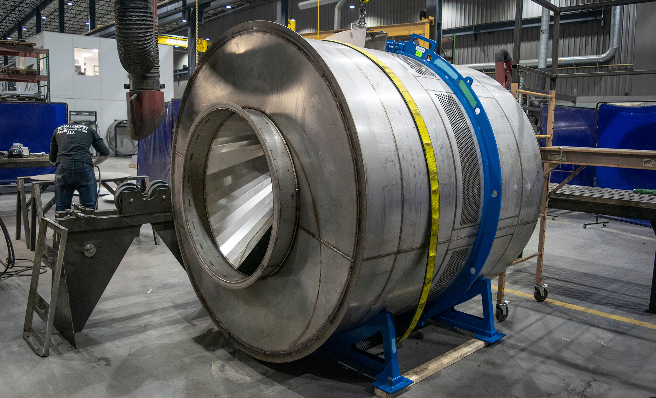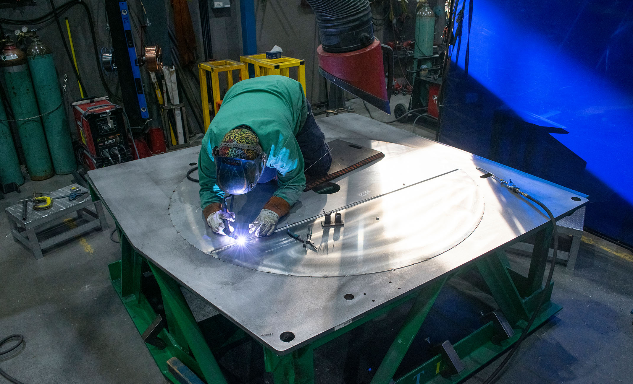 Shauna, TIG welding a stainless steel rotating weldment. This weldment is made up of perforated stainless steel sheets to create a rotating cylinder.