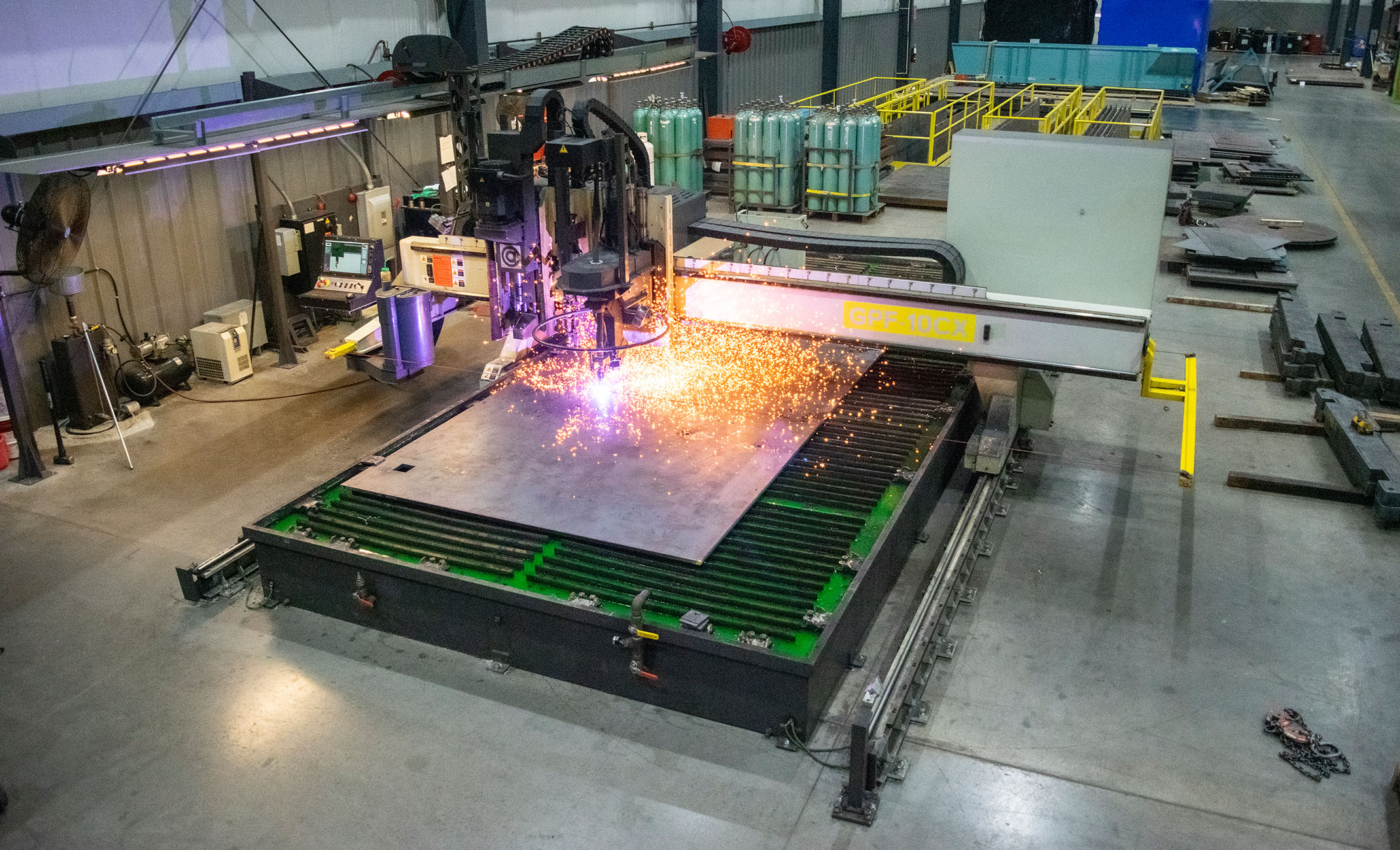 Our Controlled Automation Plasma & machining center combo allows us to plasma cut up to 3 ¼” material & torch cut up to 6” thick plate steel with a table size of 10’ x 24’. In the background you can see many heavy plate components that have been cut.