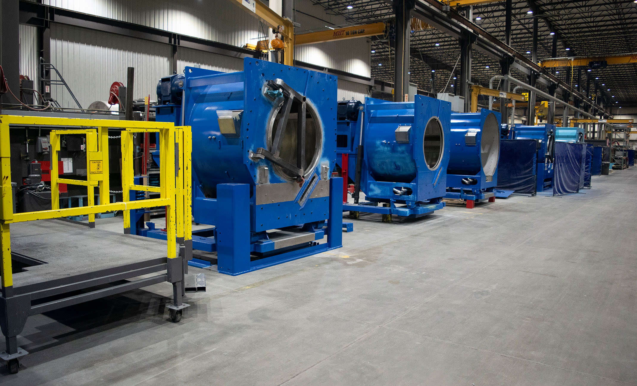 Industrial machinery in our assembly cell; each machine is in different stages of assembly. These specific machines are a mix of stainless and carbon steel with material thicknesses that range from 16 GA to 4” steel plate.